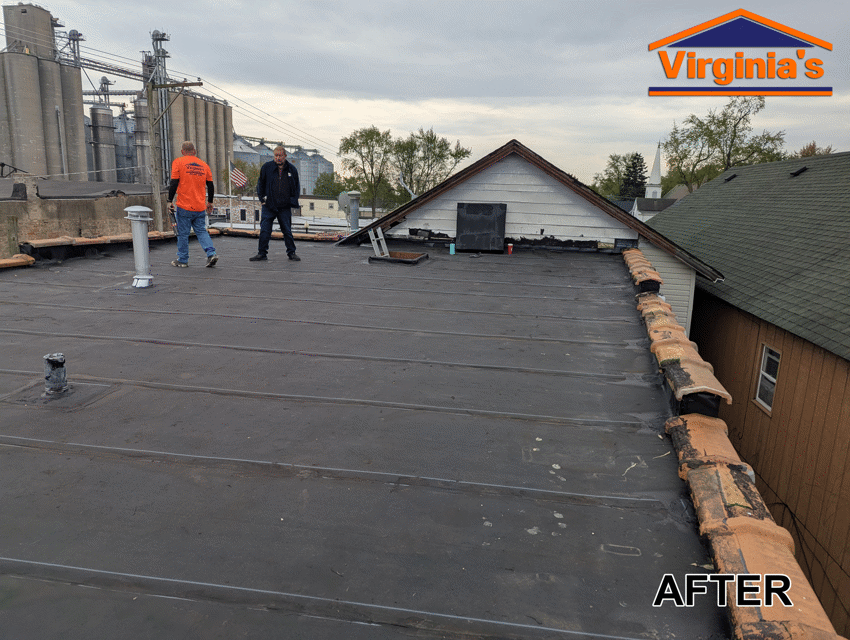 Flat roof needed replaced for a client as it was leaking down the sides, as seen in the before images. We removed the old roof and put down a new torch down roof. No more leaks and the very happy client can now continue to work on the inside.